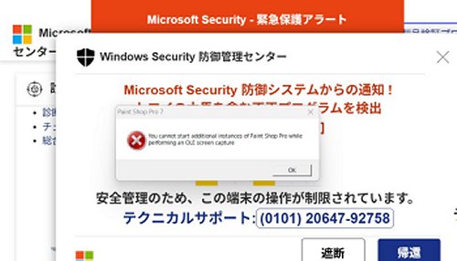 久し振りに出た偽警告表示、説明の日本語がかなり怪しい。「遮断」ってどういう意味?「帰還」って「戻る」のことかしら?サポートの(0101)で始まる電話番号は北米にかかり国際通話料金がかかるとか。