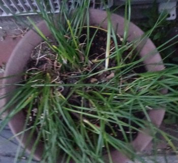 ニラを採取、細くて数が少なく一食分には全然足りない。(おかしいなあ、消滅しちゃった?)と考えて...そうそう、この鉢に植えてあったのよ。でも零れ種で増えたオキザリスに占領されちゃったんですね。