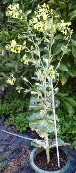 超のっぽになった踊りハボタン、黄色の花は意外ときれいなんですよね。今日は強風なので最初から鉢を寝せておきました。花茎が左に曲がっていますね。